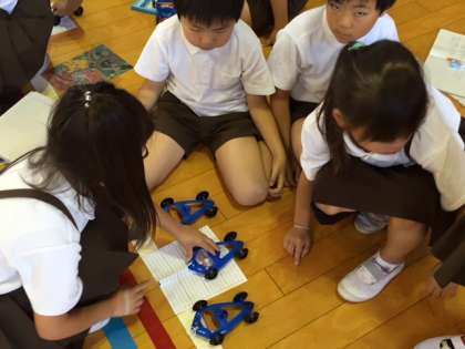 実験では、ゴムの引っ張る長さを変えたり、ゴムの本数を変えたりして車を走らせました。ゴムには物を動かす力があり、条件によって走り方がちがうということを学習しました。