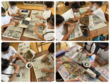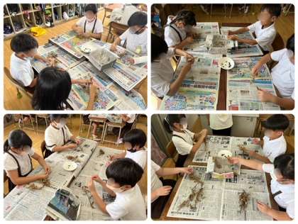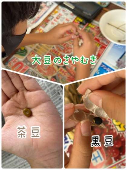 春から育てていた大豆が枯れたので、さやむきをしました。子どもたちはとっても喜んで、「もっとやりたい!」「いっぱい豆が出てきたよ〜!」と感想を口にしていました。