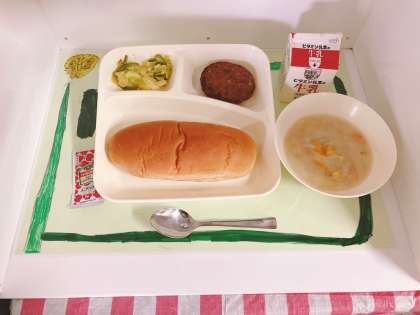 「豆乳スープ」は、じゃがいも、たまねぎ、コーン、にんじん、青みにパセリを使用し、仕上げに豆乳を使用したスープです。豆乳は、大豆から作られます。豆乳は、赤のグループの食べ物で、主に体をつくるもとになるたんぱく質が多く含まれています。
