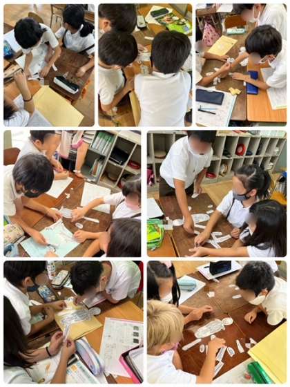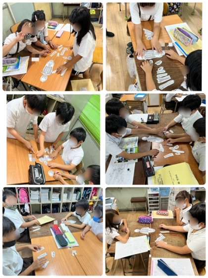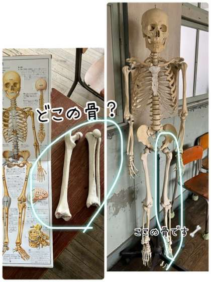 理科の授業で、実物大の骨模型はどこの部分?というクイズをした後、班ごとにほねほねパズルに取り組みました。