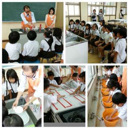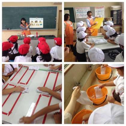 キャリア教育の一環として花王さんに来ていただき、家の仕事について教えてもらいました。油のついた食器洗いと、ぞうきんの絞り方、机の拭き方について体験しました。