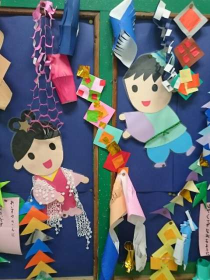 学校の廊下には1年生の七夕かざりを掲示しています。みんなの願いが短冊に、習いたての字で一生懸命書かれています。