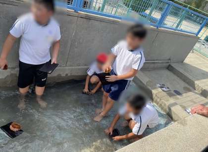 林間学習では川で焼き板を磨いたのですが、今回はプールの洗体槽に入って、ボランティアの子どもたちが放課後、焼き板を磨いてくれました。