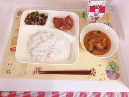 「みそ汁」は、うすあげ、かぼちゃ、たまねぎ、彩りにこまつなを使用したみそ汁です。甘みの出るかぼちゃとたまねぎを使っているので、赤みその割合が多くなっています。