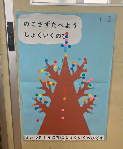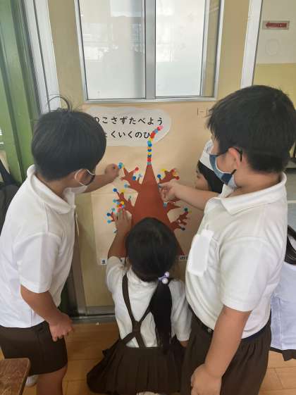 今日は、食育の日でした。時間内に残さず食べてシールをはるために、一生懸命食べていました♪