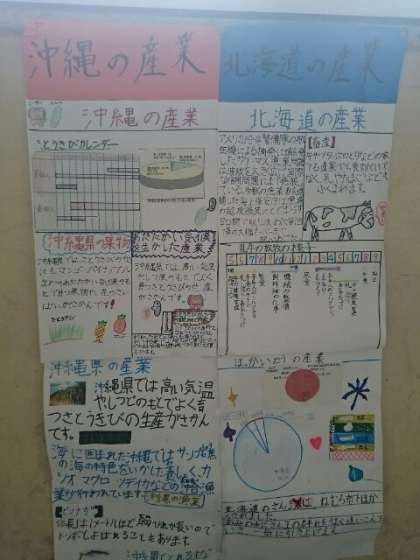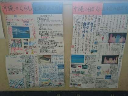 写真は5年の学習成果です。教室前に掲示しています。社会科の「さまざまな自然とくらし」で北海道と沖縄の生活について学習したものです。同じ日本でも、気候や生活ぶりが全然違うことに子どもも驚いたことと思います。その地方に合った生活の工夫を学び、大阪と比較できればいいですね。