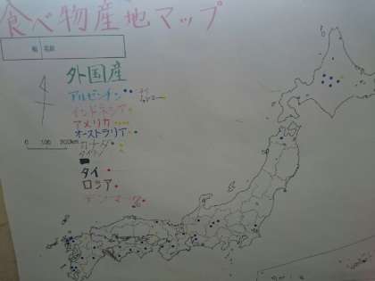 また食べ物産地マップは給食などの食材の産地を調べて記録しています。地図や表からどんなことがわかるのでしょうか?自分たちの生活に結びついた学習は楽しいですね。