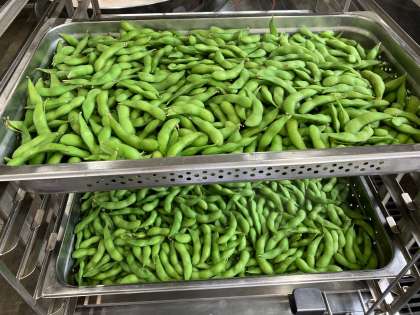 「えだまめ」は、焼き物機で蒸して、塩をふり、あえます。