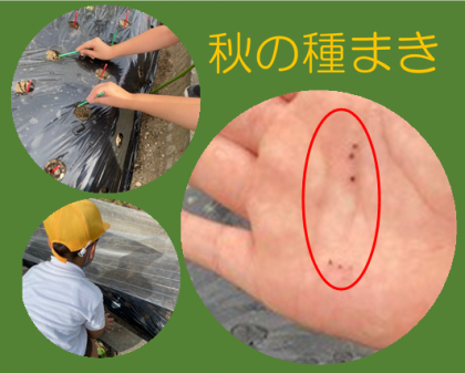 すっかり雲が高くなり秋空が広がるその下で、なかよし学級のみんなで冬野菜の種をまきました。とても小さな種(写真赤丸)を小さな穴にまき、虫よけネットを戻しました。ワイワイとにぎやかなひとときとなりました。