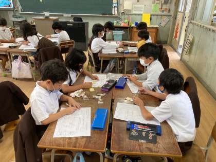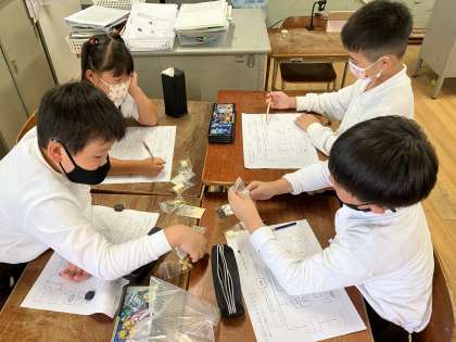 プリントにある大豆の「へんしん地図」を完成させるために、大豆製品の実物を実際に見て班で考えながら、それぞれ予想をしました。とうふや納豆など前から知っていたものもありましたが、ゆばやしょうゆなど初めて知るものもあり、とても驚いている様子でした!