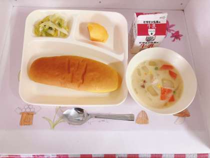 「豆乳コーンクリームシチュー〔米粉〕」は、小麦アレルギーの児童も食べることができるよう、小麦粉を使ったルウの代わりに水どき上新粉でとろみをつけます。また、牛乳アレルギーの児童も食べることができるよう牛乳の代わりに豆乳を使用しています。