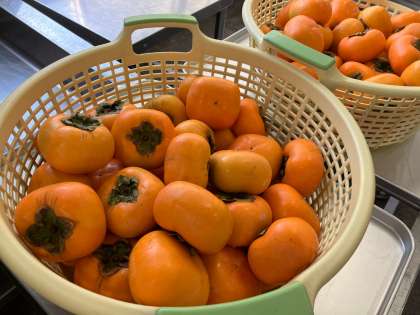 「かき(平核無柿)」は、ひとり1/4切れずつつきます。