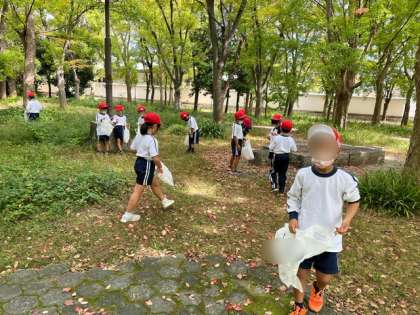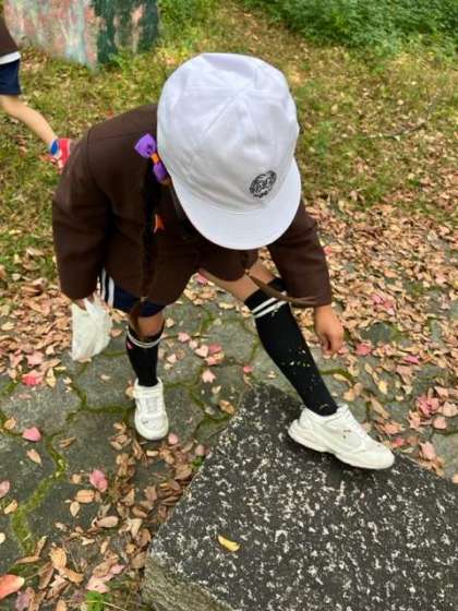 秋探しでは、落ち葉や小さなどんぐりを見つけ、袋に集めました。
