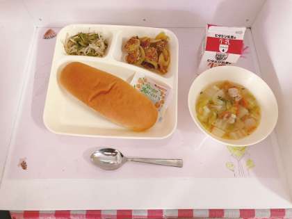 「はくさいのスープ」は、鶏肉、じゃがいも、はくさい、にんじん、コーン、青みにパセリを使っています。