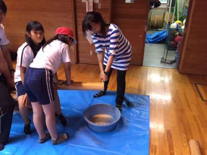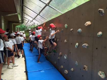 雨プログラムが続いています。室内でもいろいろと楽しめています。上の写真はクライムウォール。登山している気分でやってみると、とてもスリルがあります。「ここは断崖絶壁だ!」そんな気持ちでやっています。