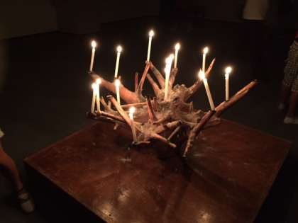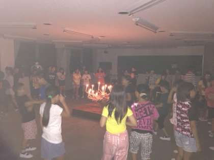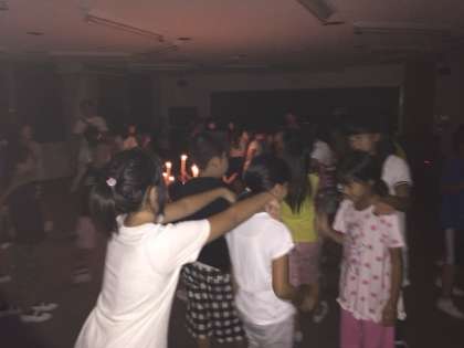 雨のため、キャンプファイヤーは残念ながら屋内でのキャンドルファイヤーに変更となりました。しかし、キャンドルの火は、なかなか幻想的で非日常的な雰囲気を演出しています。みんなが楽しめたキャンドルファイヤーでした。
