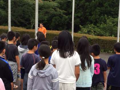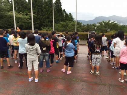 朝のつどいが始まりました。しかし、途中から雨が降ってきたのでプレイホールに移動して行いました。これから朝食です。