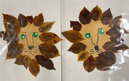 「落ち葉を拾う」→「洗う」→「乾かす」→「貼り付ける」の工程を2日に分けて行いました。どの工程も丁寧に行い、かわいらしいライオンができました。
