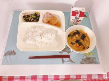 「みそ汁」は、うすあげ、たまねぎ、はくさい、にんじん、わかめを使用しています。