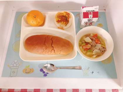 「豚肉と野菜のスープ煮」は、豚肉を主材に、じゃがいも、キャベツ、たまねぎ、にんじん、青みにえだまめを使用した洋風の煮ものです。