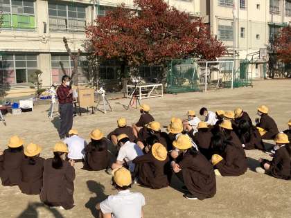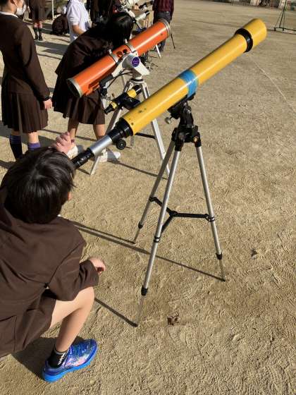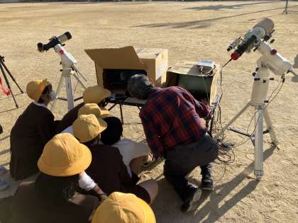 昨日、理科の特別授業「昼間の月と太陽を望遠鏡で見よう」がありました。北恩加島小学校上空には雲がほとんなく、青空が広がっていました。絶好のコンディションの中、6年生の子どもたちは交代で数種類用意してくださった望遠鏡や双眼鏡で太陽や月を観測していきました。通常、太陽を直接見ることはできませんが、特殊なフィルターを付けることで、太陽のフレアや黒点なども観測することができました。子どもたちからは、「見えた!見えた!」や「すごい!」など喜びや驚きの声が多く聞こえてきました。