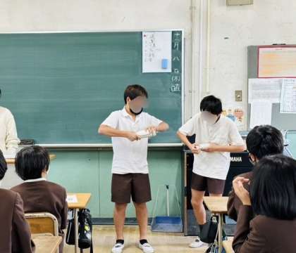 そのあと、骨のはたらきについて学び、骨の模型を使って、じょうぶな骨とはどんな骨なのかを確認しました。じょうぶな骨はしっかりつまっていて、そうでない骨はスカスカになっていて、どちらの骨が折れやすいか模型で実感することができました。