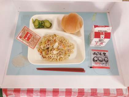 「和風焼きそば」は、豚肉を主材に、塩、こしょう、うすくちしょうゆ、こいくちしょうゆで味付けした焼きそばです。食べる時にかつおぶしをかけます。