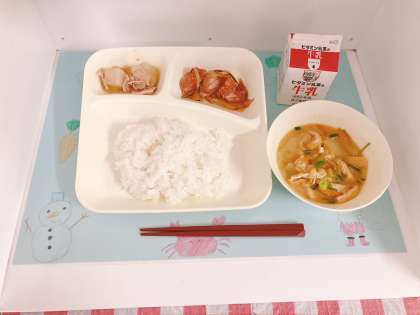 「みそ汁」は、うすあげ、はくさい、にんじんを使用し、青みに青ねぎを使用しています。