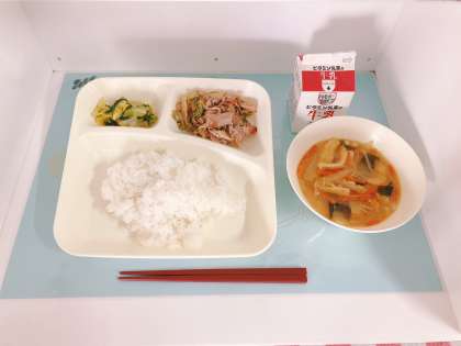 「みそ汁」は、にぼしでだしをとり、うすあげ、だいこん、にんじん、えのきたけ、わかめを使用しています。