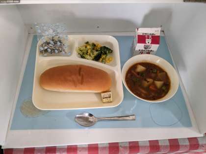 「ビーフシチュー」は、牛肉を主材に、小麦粉と綿実油で作ったブラウンルウで煮こみます。毎回好評な献立です。