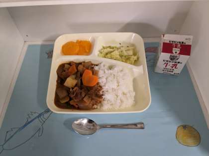 「ハヤシライス」は、児童に大変人気の献立のひとつです。牛肉を主材に、小麦粉と綿実油で作る手作りブラウンルウ、デミグラスソースなどで煮こみ、仕上げます。