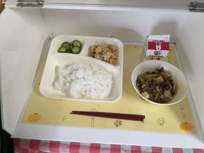 「すき焼き煮」は、児童生徒に毎回好評な献立です。牛肉を主材に、糸こんにゃく、とうふ、旬のはくさい、白ねぎ、まいたけを使用しています。