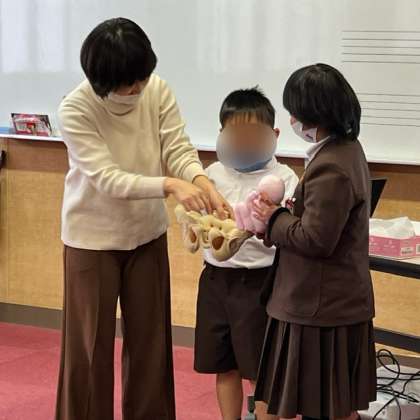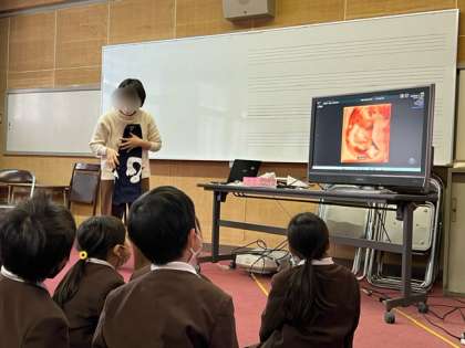 助産師さんにお越しいただき、胎児の成長や出産についてお話を聞きました。脈を感じて自分の命を体感したり、妊娠中の先生に協力してもらい、胎児の心音を聞いたりすることができました。命はもともととても小さかったこと、生まれてくることが奇跡であること、一人一人がすごい力を持っていて、かけがえのない存在であることなど、貴重な動画や写真などを見せていただきながら、学び多き1時間となりました。ありがとうございました。