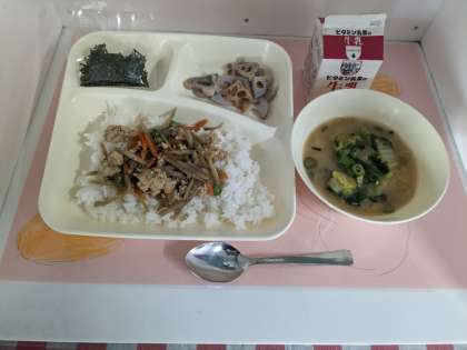 「鶏ごぼうご飯」は、しょうが汁で下味をつけた鶏ひき肉を主材に、つきこんにゃく、ごぼう、にんじん、グリンピースを使用しています。児童生徒に大好評な混ぜご飯です。