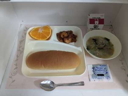 「中華がゆ」は、肉だんごを使った児童に好評な献立です。だいこん、にんじん、しいたけ、彩りにチンゲンサイを使っています。ごま油を使用することで、中華らしさを出しています。