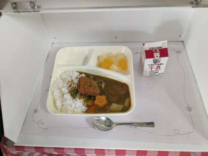 児童に好評な「カツカレーライス」です。一口トンカツは1人1コずつつきます。その一口トンカツを牛肉を主材とした、カレーライスに添えます。