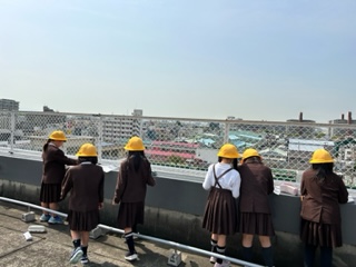 社会科の学習で自分たちの住んでいる身のまわりにどんな建物があるか調べに行きました。隣の泉尾工業高校さんのご好意で屋上に入らせていただきました。天気も良く大阪のシンボルである通天閣も見ることができ、子どもたちも大満足でした。