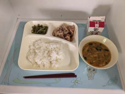 「みそ汁」は、うすあげ、キャベツ、にんじん、えのきたけを使った具だくさんのみそ汁です。青みに青ねぎを使用しています。