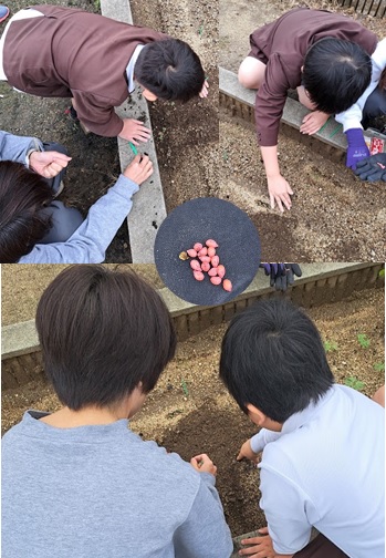 なかよしタイムの取り組みでポップコーンを作るために、専用のとうもろこしの種をうえました。人差し指で穴をあけて、4粒ずつ土の中に入れました。夏に立派な実をつけて、みんなでパンッパンッと弾けさせて、まさに弾ける美味しさのポップコーンを作ることをめざしてお世話をしていきます。
