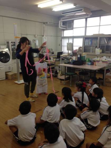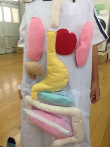 体重測定をしました。測定前には保健の先生から「からだのしくみ」について話を聞きました。保健の先生お手製のエプロンをつけ「食べ物の通り道」について学習しました。