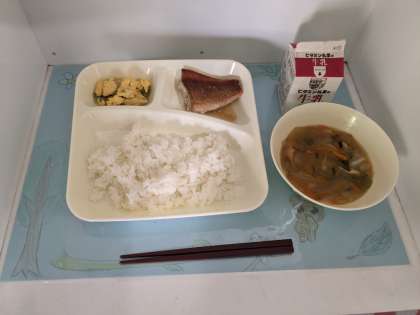 「みそ汁」は、うすあげ、キャベツ、たまねぎ、にんじん、青みに青ねぎを使い、あっさりと仕上げています。
