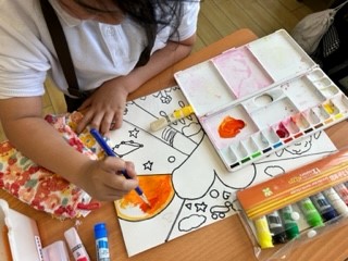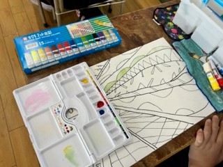 赤・黄・青の三原色を使って混色をしました。同じ色を混ぜても量によって色の違いが出ることに驚いている子どもたちでした。みんな丁寧に塗り作品を完成させることができました。