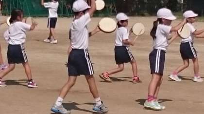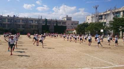 最後に3・4年生のエイサーです。音楽をよく聞いて、みんなでパーランクを打ちます。できるだけ同じタイミングで打てるように気をつけます。音がそろうと、自然と振り付けもそろってきます。今日は、2回目の外での練習でした。隊形移動をしっかりと覚えることができました。あとは一人一人がしっかり高く足を上げ、大きな振り付けで踊れるかにかかってきます。がんばってください。