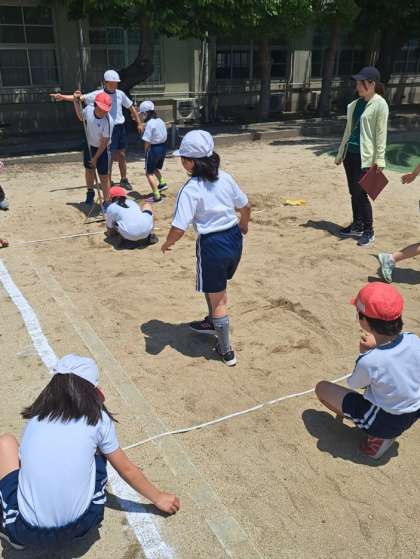 16日 5年生が2年生の新体力テスト3種目【50m走】【ソフトボール投げ】【立ち幅跳び】のお手伝いをしました。5年生は高学年として下級生を思いやる心を、2年生は上級生を敬う心を育てることを目的として取り組みました。5年生がお手本を見せて大きな拍手が起こった時は、ほのぼのとした雰囲気が運動場を包みました。