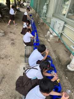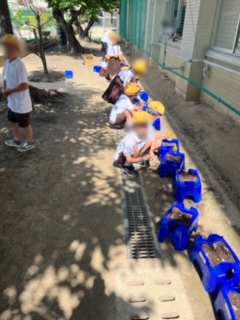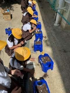 自分の植木鉢に土を入れ、たねをまき、水をあげました。
