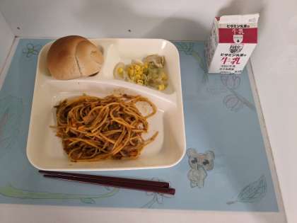 「ミートソーススパゲッティ」は、牛ひき肉、豚ひき肉を使い、小麦粉と綿実油をよくいためて作るブラウンルウで仕上げます。毎回児童に好評な献立です。