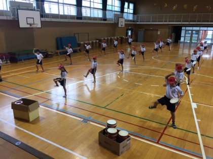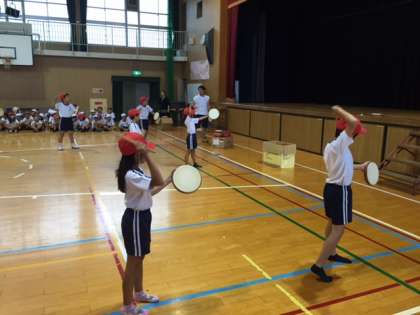 3・4年生は合同で練習してエイサーのパーランクの音を合わせています。