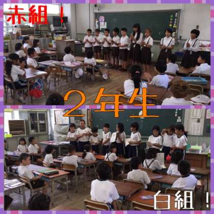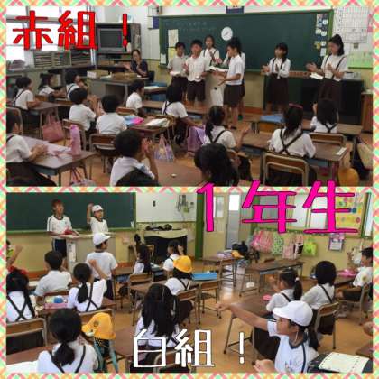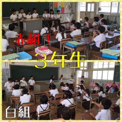 今日と明日の朝の時間は学年ごとに応援の練習をします。それぞれの学年で白組と赤組に分かれて練習しました。教えるのはもちろん応援団。教室ごとにグループで出張して、かけ声や振り付け、手拍子の打ち方を教えていきます。最初は前でもじもじしていた応援団員もいましたが、慣れてくると的確な指示を出し、教わる子どもたちが元気な声を出せるようになってきました。自分たちの力で運動会を盛り上げるには、苦労も多いと思います。みんなで力を合わせて、がんばってください!