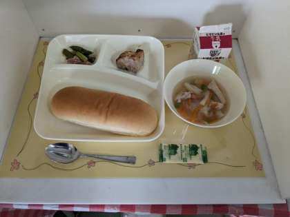 「スープ」は、鶏肉で旨みをだし、じゃがいも、たまねぎ、にんじん、青みにグリンピースを使用した彩りのよいスープです。