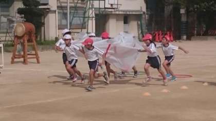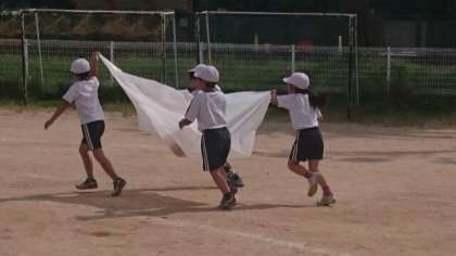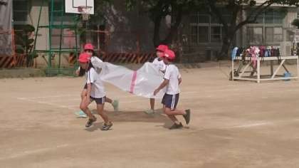 4年生の団体競技も新種目!名づけて「ふろしき!ワッショイ!」。大きなふろしきを4人で持ち、あるものを運んで競います。今日は、バスケットボールでした。さあ、本番では何が運ばれるのでしょうか?乞う、ご期待!